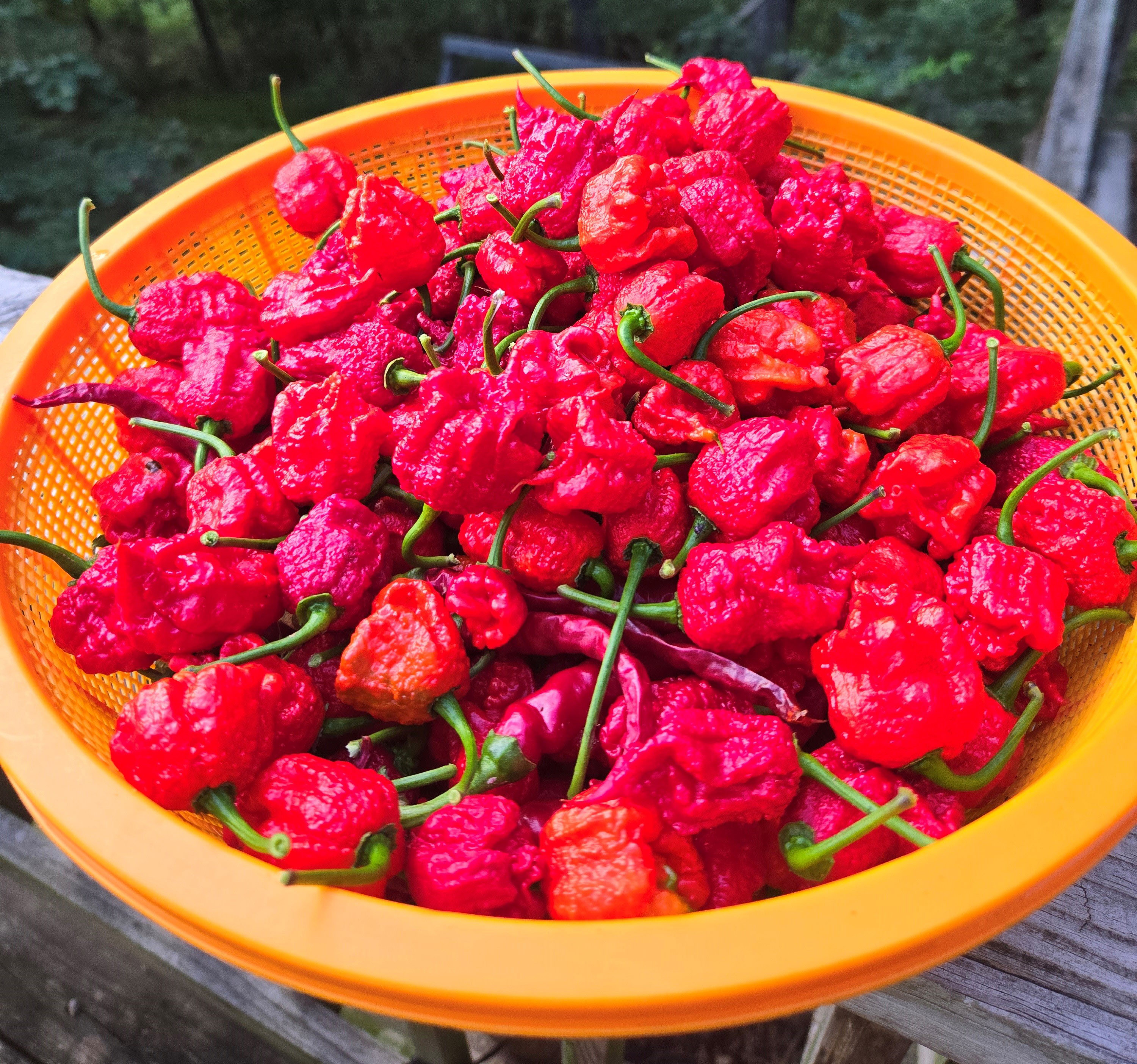 The Carolina Reaper averages between 1.6 to 2.2 million Scoville Heat Units (SHU). The pepper has more of a sweet fruity flavor great for this super hot sauce.